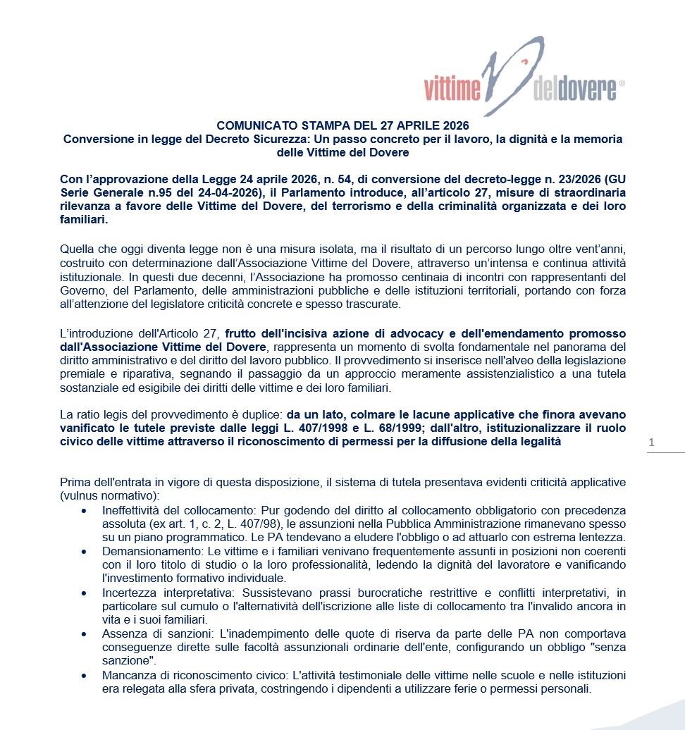 L’Associazione Vittime del Dovere informa che lunedì 16 marzo 2026, alle ore 10.00, si terrà un’importante audizione presso il Consiglio regionale – Assemblea legislati...Continua