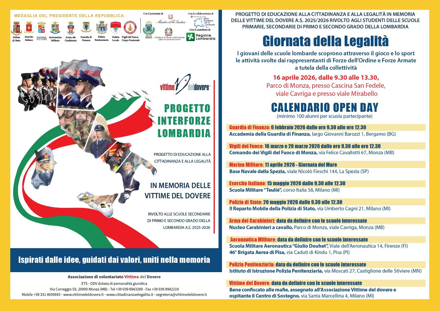 Il 6 febbraio, alle ore 9, presso l’Accademia della Guardia di Finanza, piazzetta Giulio Marcovigi 3, Bergamo, si terrà l’Open Day in collaborazione con la Guardia di Finanza. L’incontro fa parte del Progetto Interforze “Esercito Italiano, Polizia di Stato, Arma dei Carabinieri, Guardia di Finanza, Aeronautica Militare, Marina Militare, Polizia Penitenziaria, Polizia Locale e Vigili del Fuoco, in memoria delle Vittime del Dovere” a.s. 2025/2026, rivolto alle Scuole primarie e secondarie di primo e secondo grado della Lombardia.