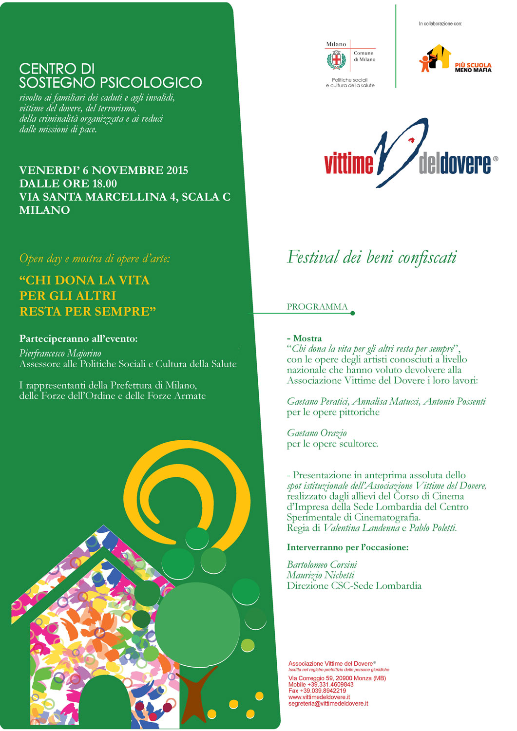COMUNE DI MILANO - PROGRAMMA 3° FESTIVAL DEI BENI CONFISCATI - APERTURA AI CITTADINI DEL CENTRO DI SOSTEGNO PSICOLOGICO DELL'ASSOCIAZIONE VITTIME DEL DOVERE